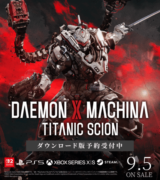 株式会社マーベラスは、9 月 5 日発売の Nintendo Switch™ 2 /PlayStation®5/Xbox Series X|S /Steam®向けメカアクションゲーム『DAEMON X MACHINA TITANIC SCION(デモンエクスマキナタイタニックサイオン)』にて、本日よりダウンロード版の予約受付を開始しました。あわせて、公式サイトにて各種特典や各エディションの内容を公開しました。