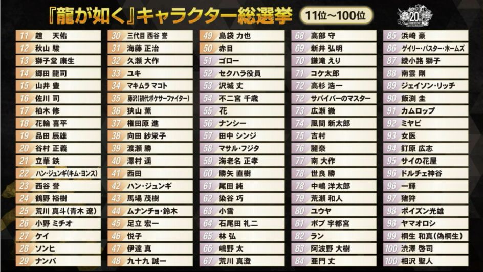 総選挙1位は「真島吾朗」!『龍が如く』キャラクター総選挙の結果が発表 記事へ戻る 2 / 2 2位「桐生一馬」3位「冴島大河」。TOP10には「エリック・トミザワ」や「東徹」など中間発表時から順位を伸ばしたキャラも... [続きを読む]