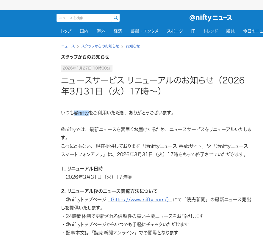 「@niftyニュース」のWebサイトおよびスマホアプリが3月31日にサービス終了。ニュースサービスリニューアルに伴い、今後はトップページにて「読売新聞」最新ニュース見出しを提供 記事へ戻る 1 / 1 ニュースサービスリニューアルに伴い、今後はトップページにて「読売新聞」の最新ニュース見出しを提供。記事本文は「読売新聞オンライン」での閲覧となる... [続きを読む]