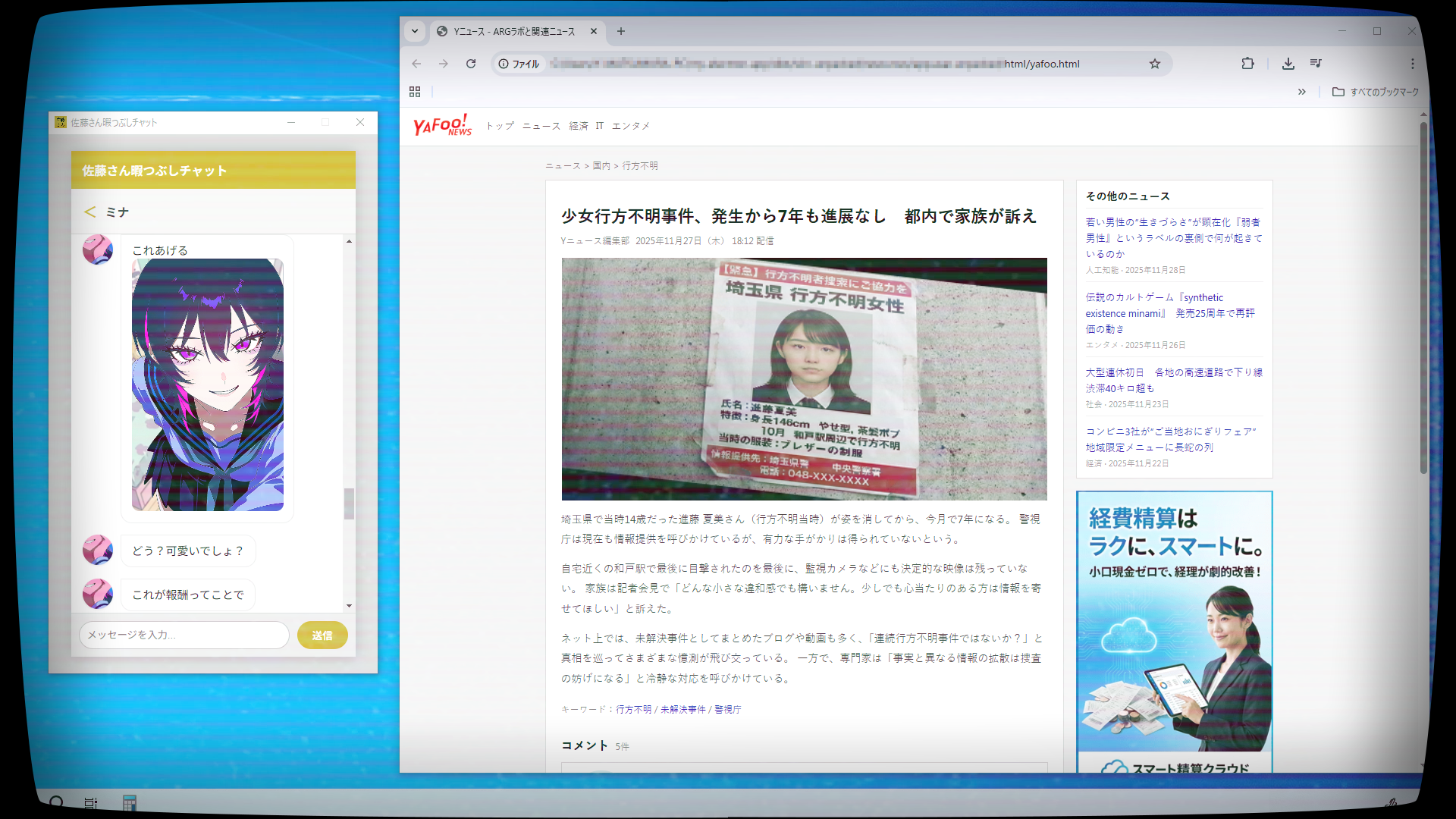 実在するWebページを調査して謎を解く“デスクトップ侵食型”ホラーゲーム『佐藤さん暇つぶしチャット.exe』が3月13日よりリリース。謎の少女「ミナ」と秘密結社を潰す“ごっこ遊び”に勤しむ 記事へ戻る 2 / 7 チャットアプリで謎の少女「ミナ」とやり取りをしながら、彼女が語る「暗躍連合軍団(通称A.R.G)」という秘密結社を潰す“ごっこ遊び”に勤しむ... [続きを読む]