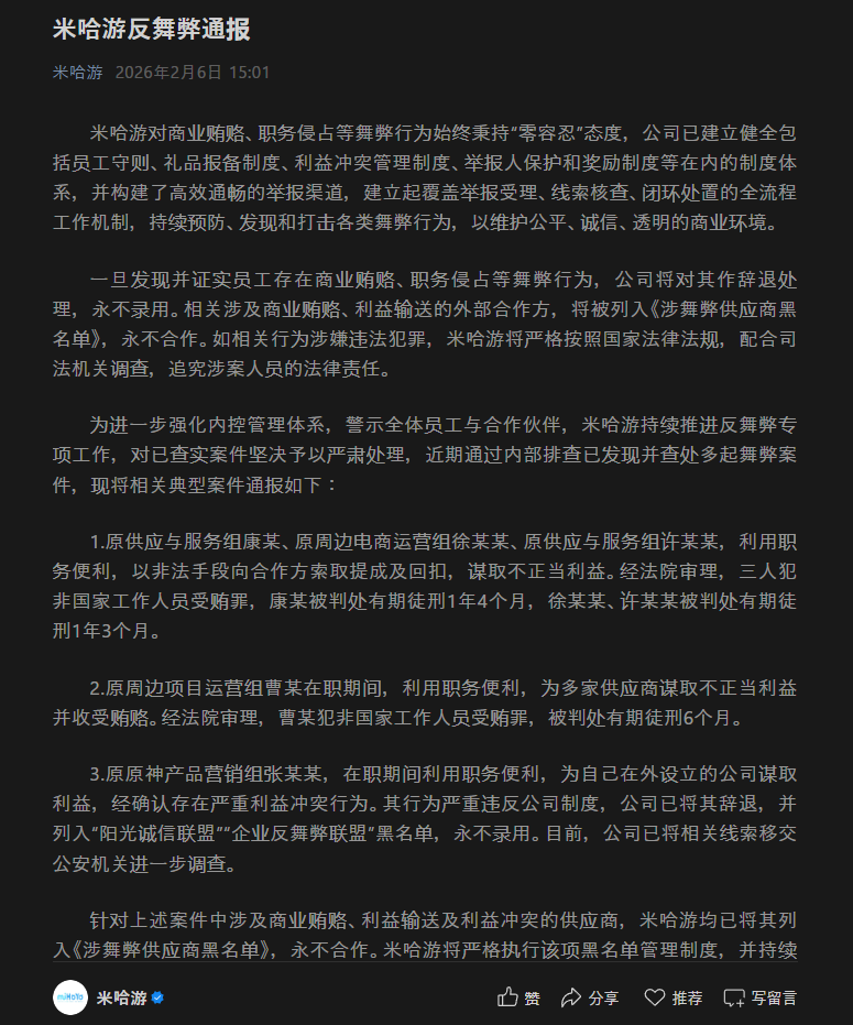 miHoYoが社内で起きた「不正行為」を公表。収賄罪で元社員4名が有罪、関与した取引先はブラックリスト入り。贈収賄や横領などの不正行為を一切容認しない姿勢を貫く 記事へ戻る 1 / 2 2月6日、miHoYoは同社における不正行為に関するレポートを、中国のSNS微信にて投稿した。 投稿内では、直近の内部調査により発見・処罰された事例3件と、ブラックリストとなっている企業リストが公表されている。... [続きを読む]