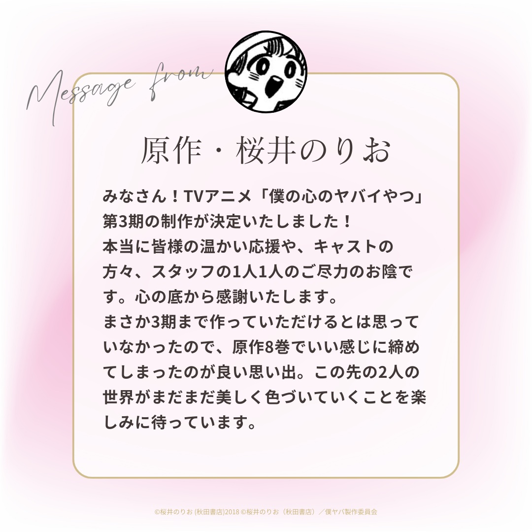3月14日、TVアニメ『僕の心のヤバイやつ』第3期の制作が決定、2027年に放送されることが発表された。 『僕の心のヤバイやつ』は、現在劇場版が大ヒット公開中。また、第3期の制作発表を記念して、原作者の桜井の... [続きを読む]