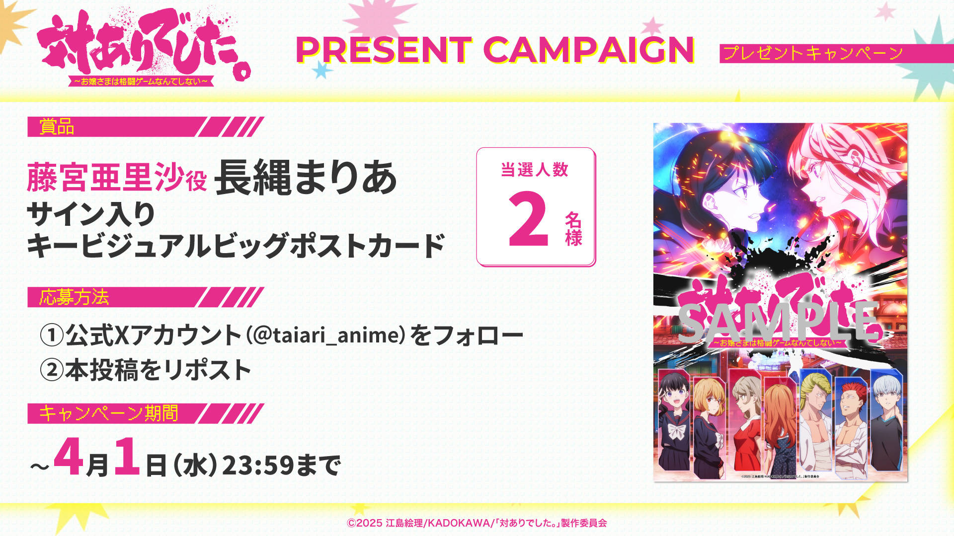 TVアニメ『対ありでした。~お嬢さまは格闘ゲームなんてしない~』7月に放送決定!小学生ゲーマー・藤宮亜里沙役として長縄まりあさんが出演することも発表 記事へ戻る 5 / 7 TVアニメ『対ありでした。~お嬢さまは格闘ゲームなんてしない~』の放送時期が、7月に決定したことが発表された。 また、新たにキービジュアルも公開され、追加キャストとして長縄まりあさんが出演することなど... [続きを読む]