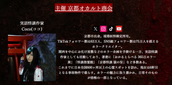 案内人は、日本全国 600 ヶ所の心霊スポットを取材し、実話怪談本やお化け屋敷を手掛けるホラークリエイターの「Coco」。SNS の総フォロワー数は 75 万人以上を誇り、若い世代を中心に国内外からも支持を集めています。
