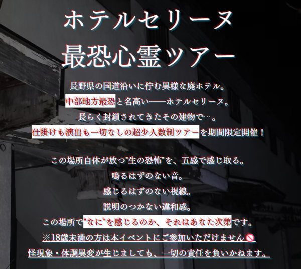 長年ネット上で“中部地方最恐スポット”として全国的に知られ、多くの心霊系 YouTuber が訪れてきた長野県上水内郡信濃町の廃宿泊施設「ホテルセリーヌ」を舞台に、公式ツアーイベント『ホテルセリーヌ最恐心霊ツアー』を、2026 年 5 月 2 日(土)~5 日(火)の 4 日間限定で開催いたします。本企画は、ホテルセリーヌを物件所有者の許可のもと安全に管理し、一般向けに公開する今までに例のない試みです。