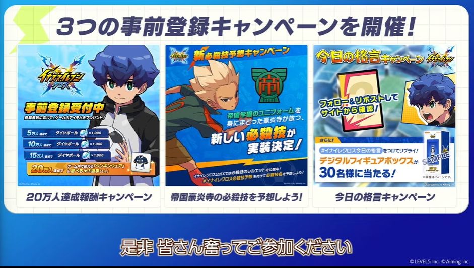 事前登録にあわせて、3つのキャンペーンも実施中だ。なかでも、過去に話題になっていた“帝国学園のユニフォームを着た豪炎寺”には新必殺技が実装されるとのこと。どんな技を使うか楽しみである。