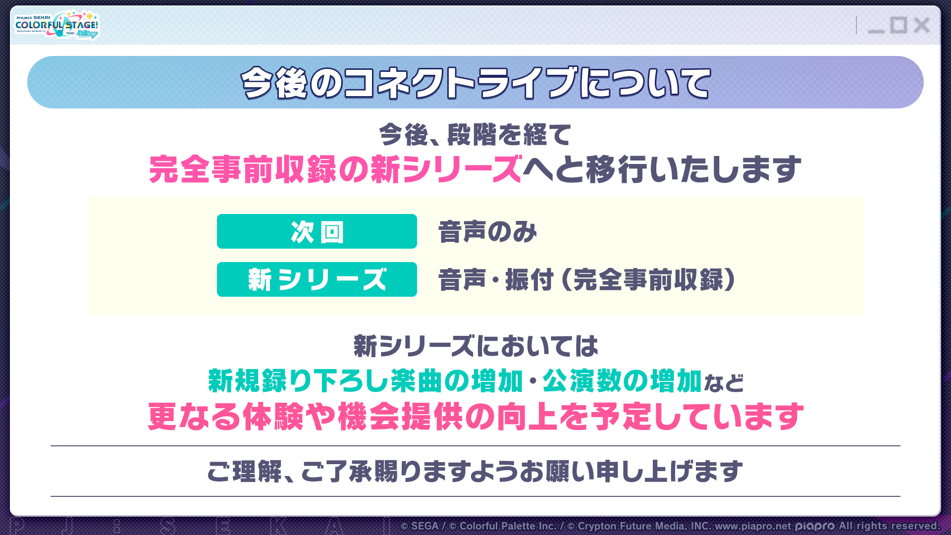『プロセカ』スペシャルコネクトライブ「Parallel Paaaarty!!!!」が5月10日に開催へ。全キャラが“特別な組み合わせ”で出演。新規録り下ろし楽曲は13曲で、キービジュアルはくるみつ氏が担当 記事へ戻る 5 / 5 新規録り下ろし楽曲は13曲で、キービジュアルはくるみつ氏が担当。また、今後は段階を経て完全事前収録の新シリーズへ移行していく... [続きを読む]