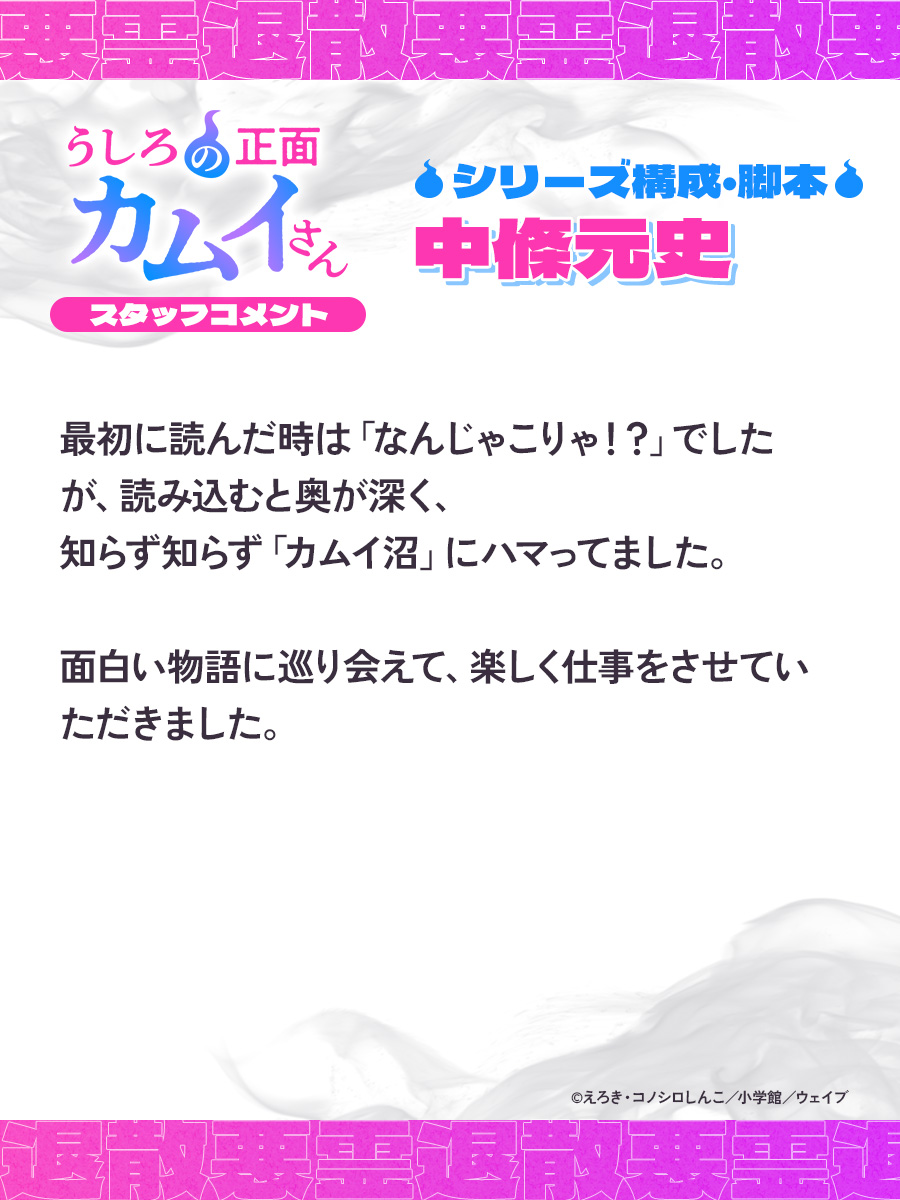 怪異が性癖の霊能力者が“除霊”しまくるTVアニメ『うしろの正面カムイさん』が2026年7月放送決定。幽霊を引き寄せる女子高生と、”前代未聞のヤリ方”で除霊する霊能力者が繰り広げる、“エッッ”なホラーコメディ 記事へ戻る 14 / 18 幽霊を引き寄せる特異体質の女子高生・シヅカと、"前代未聞のヤリ方"で除霊するカリスマ霊能力者・カムイが繰り広げる、“エッッ”なホラーコメディ... [続きを読む]